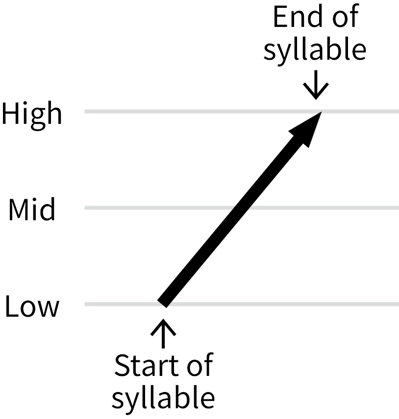 Notice that each black line shows the pitch of a tone from the start to the end of a syllable. For example, Tone 2 goes up from the low pitch at the start of the syllable to the high pitch at the end of the syllable.