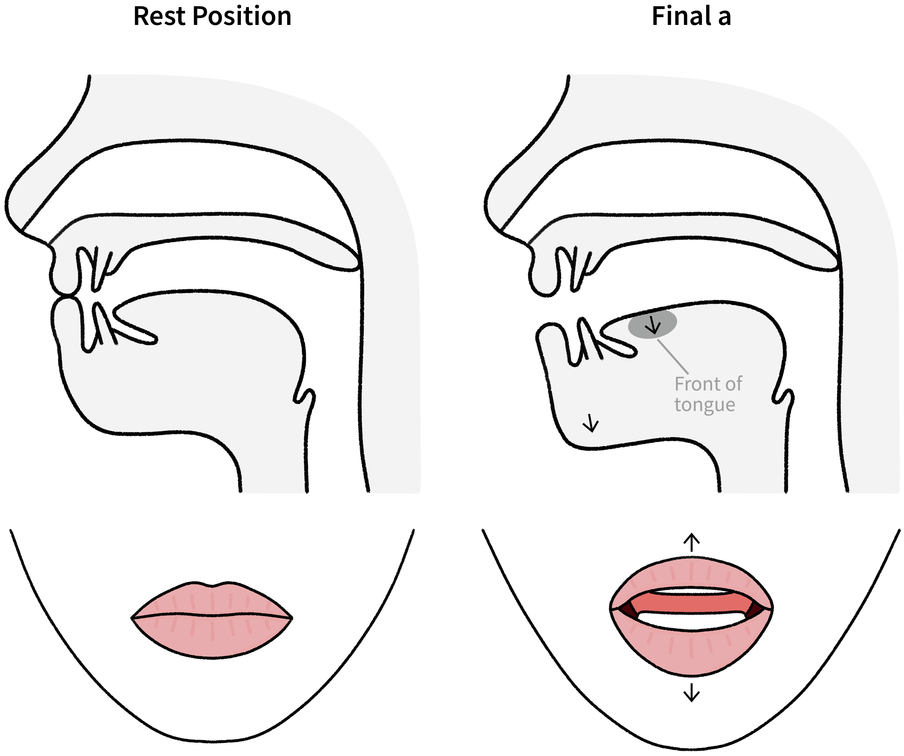 Tongue Position: Open your mouth a little by lowering your lower jaw a little. Lower the front of your tongue a little.