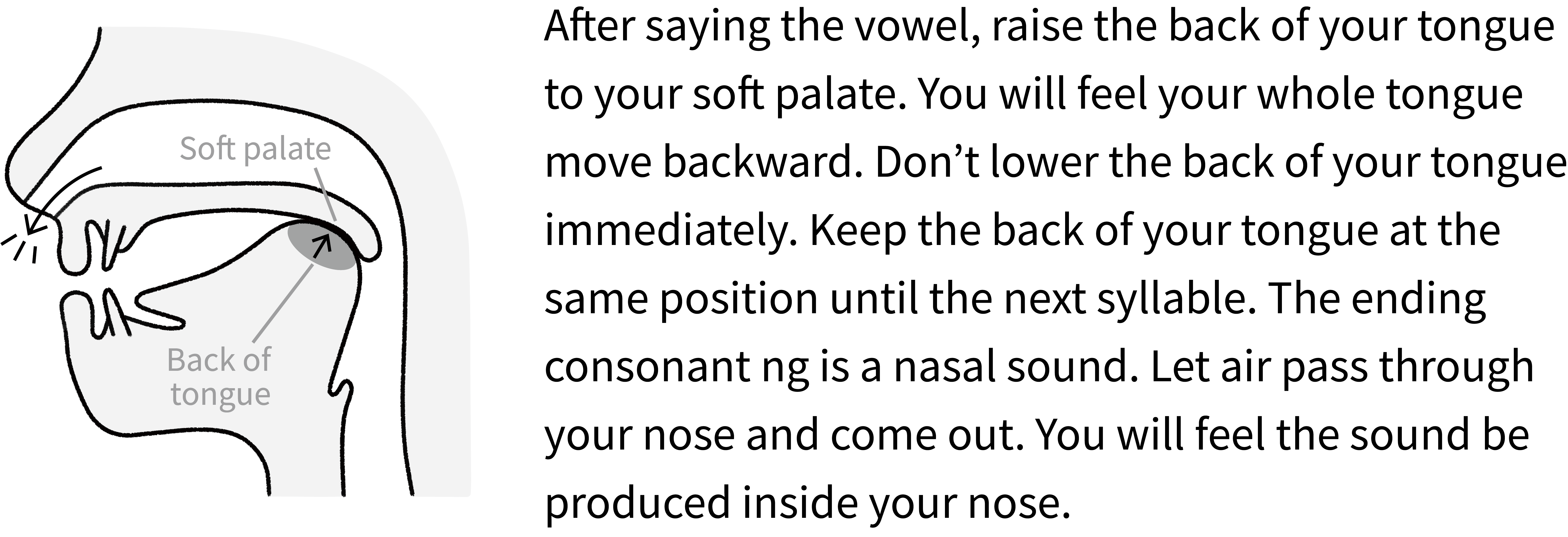 Step 1 Listen to the finals ending with -ng. Pay attention to the vowels i in ing and u in ung. They sound slightly different from when we say them individually.